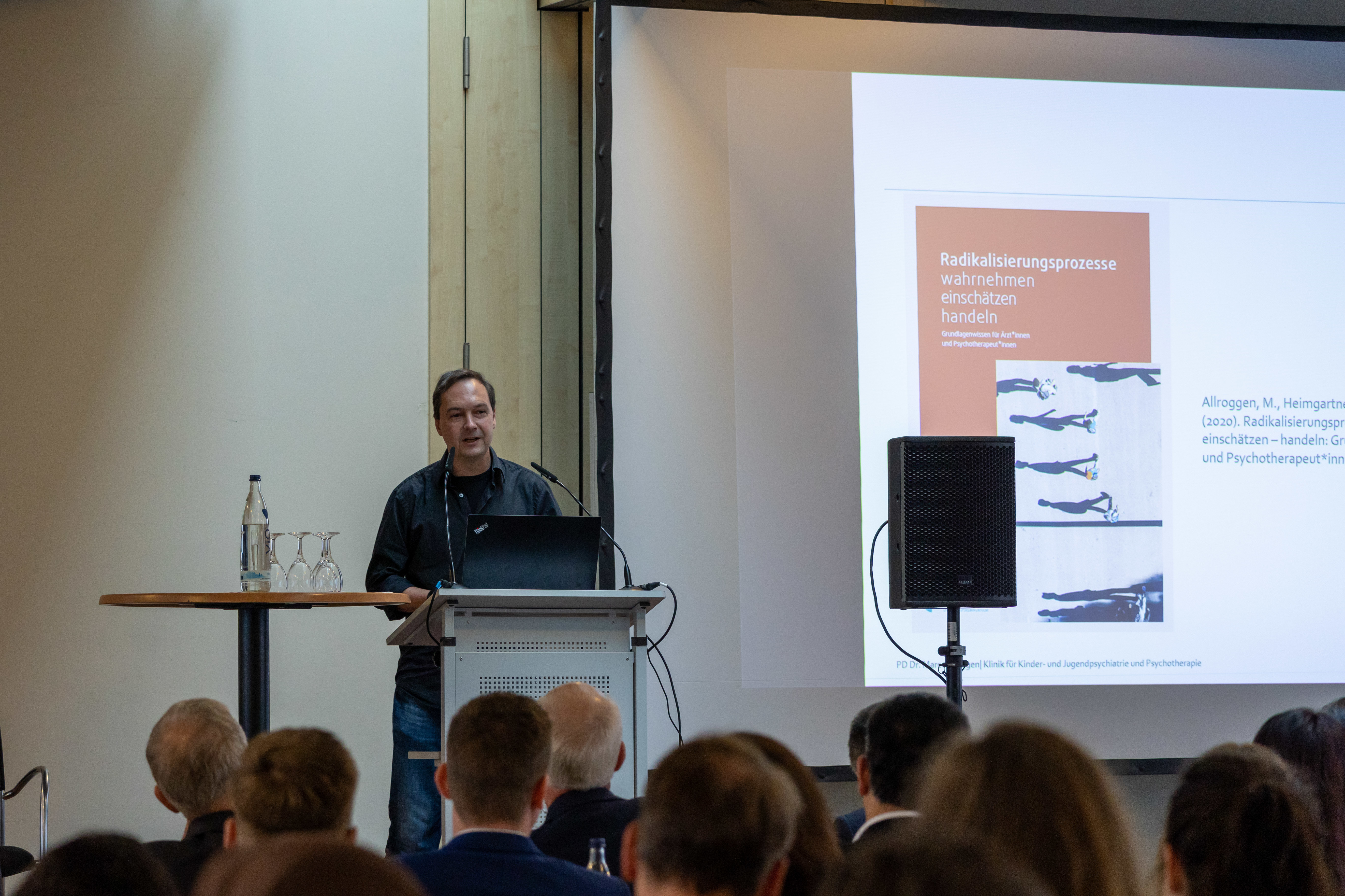 Dr. Marc Allroggen vom Universitätsklinikum Ulm beschäftigte sich im zweiten Fachvortrag mit der „Behandlersicht“. Dabei machte er auf die Bedeutung von psychischen Störungen in der Entstehung von extremistischer Gewalt aufmerksam und schilderte deren Auswirkungen auf die Deradikalisierungsarbeit. Für die Heilberufe zeigte Dr. Allroggen die vielfältigen Berührungspunkte mit dem Bereich Extremismus auf. Er betonte, dass eine Integration von Heilberufen und insbesondere Psychiaterinnen und Psychiatern sowie Psychotherapeutinnen und Psychotherapeuten in die Extremismusprävention sinnvoll und möglich sei. Voraussetzung dafür seien aber spezifische Strategien und Konzepte sowie eine klare Aufgabendefinition in Abgrenzung zu anderen Akteuren der Extremismusprävention. Benötigt würden zudem Fortbildungen und Netzwerke für Heilberufe im dargestellten Themenfeld.
