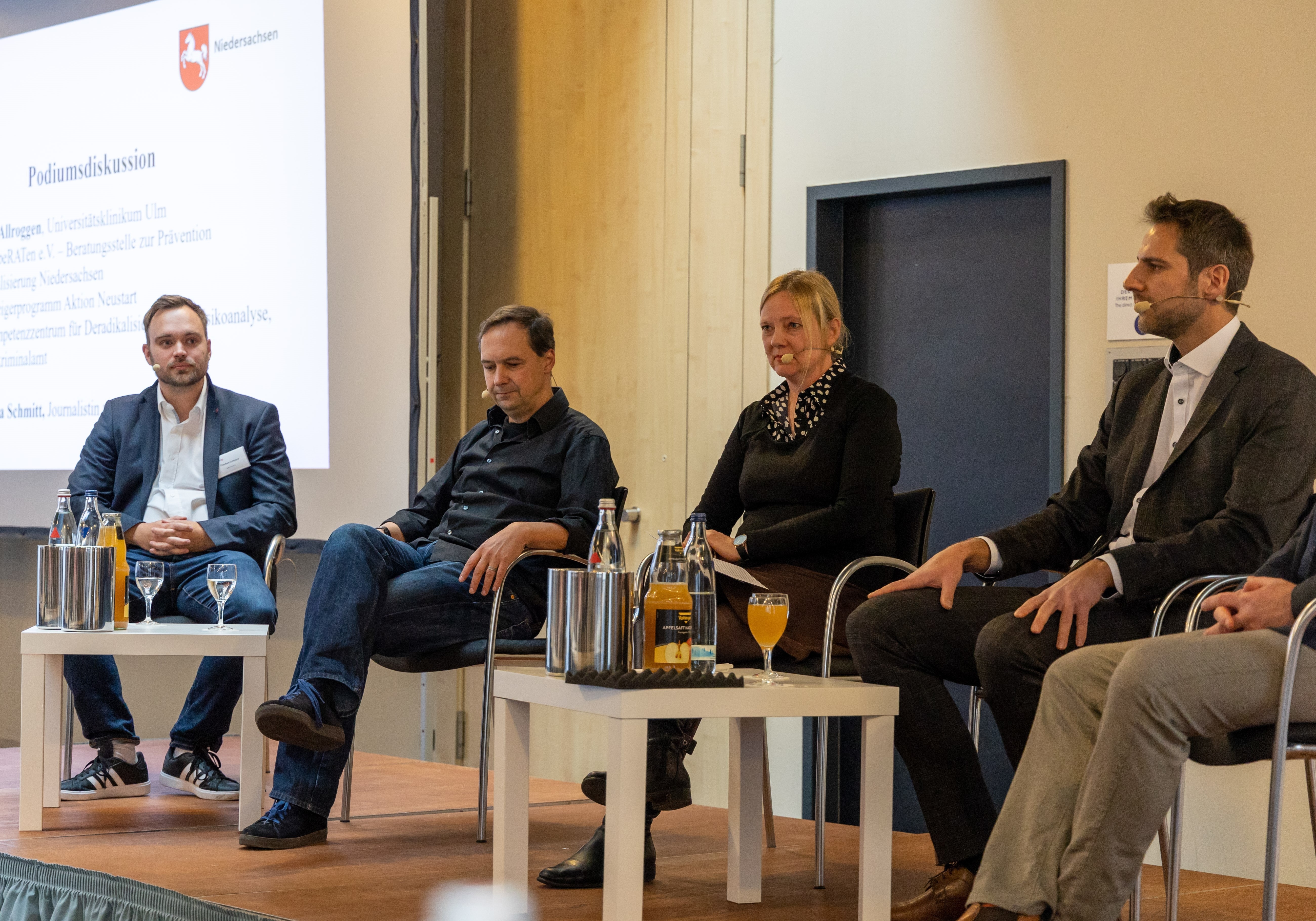 Aufbauend auf den Fachvorträgen und anhand von Fallbeispielen diskutierten Dr. Marc Allroggen (Universitätsklinikum Ulm), Dominik Irani (Bayerisches Landeskriminalamt) und Thorben Lehners (Beratungsstelle beRATen e. V.) zusammen mit einem Mitarbeiter des Aussteigerprogramms „Aktion Neustart“ (Niedersächsischer Verfassungsschutz) und unter der Moderation von Cosima Schmitt (Journalistin und Autorin bei der ZEIT) über die Möglichkeiten und Herausforderungen in der praktischen Arbeit, aber auch über die Grenzen der Zusammenarbeit aufgrund unterschiedlicher Aufträge und gesetzlicher Rahmenbedingungen. Deutlich wurde, dass psychische Störungen im Kontext von Radikalisierung schon immer eine Rolle gespielt haben. Die Experten des Podiums waren sich einig, dass die multiperspektivische Betrachtung von Fällen sowie eine gut vernetzte Zusammenarbeit unabdingbar dafür sind, islamistische Radikalisierung im Kontext psychischer Auffälligkeiten rechtzeitig zu erkennen (oder auszuschließen), um somit frühzeitig präventiv eingreifen zu können.