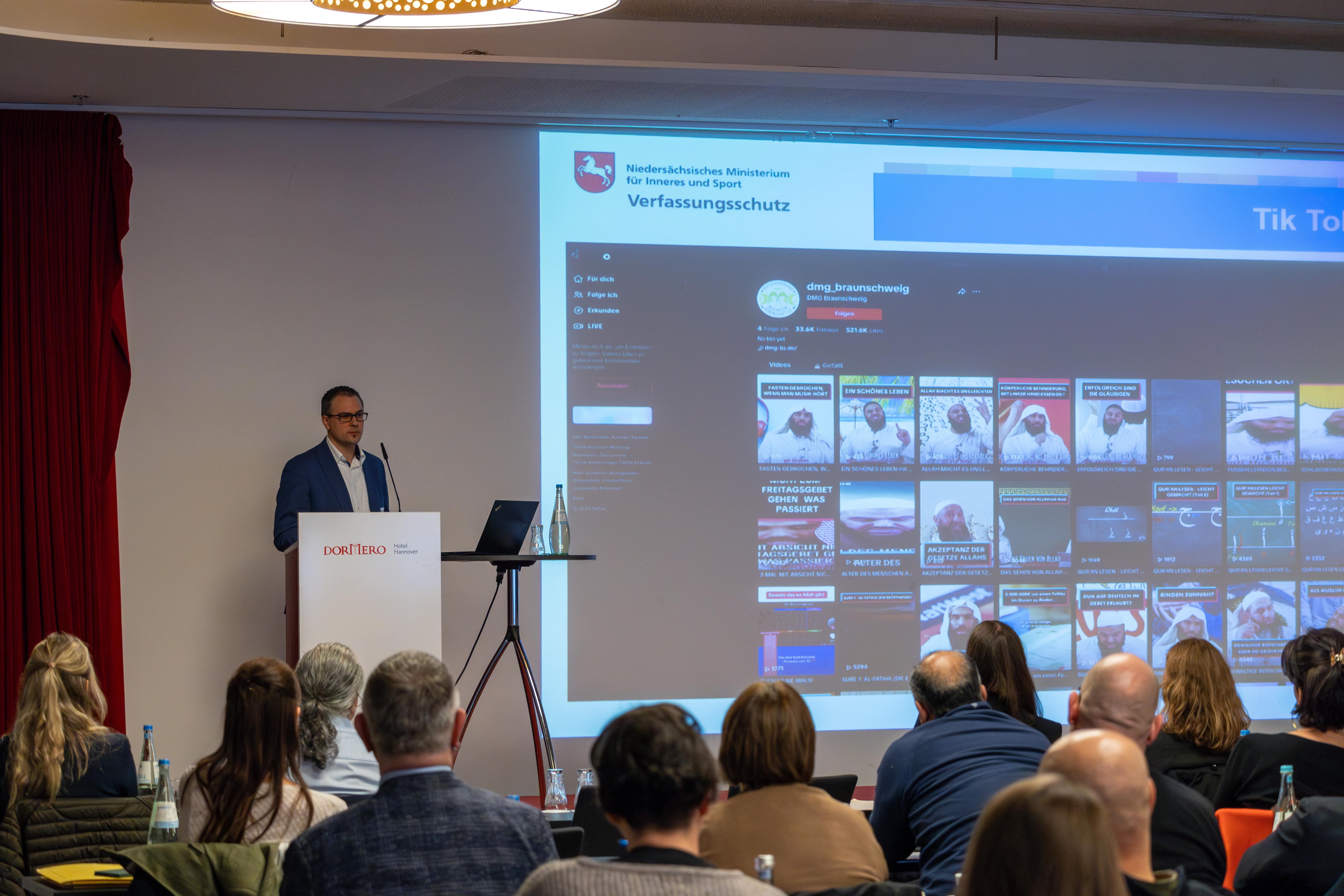 In dem ersten Fachvortrag klärte Michael Kaspar vom Niedersächsischen Verfassungsschutz über die Aktivitäten der islamistischen Szene im Netz auf. Hierfür ging Kaspar auf die unterschiedlichen Plattformen ein und nahm auf das generelle Nutzerverhalten von Jugendlichen Bezug. „Gerade Salafisten nutzen die aktuell populären Plattformen, wie Instagram oder TikTok, um ihre Ideologie in inhaltlich sehr verkürzter Form, aber modern aufbereitet einem großen Publikum zugänglich zu machen“, so Kaspar. Anhand der „Deutschsprachigen Muslimischen Gemeinschaft e.V.“ (DMG) in Braunschweig wurde verdeutlicht, welche Narrative von der islamistischen Szene bedient werden, und wie versucht wird, eine Deutungshoheit über eine Emotionalisierung herbeizuführen.