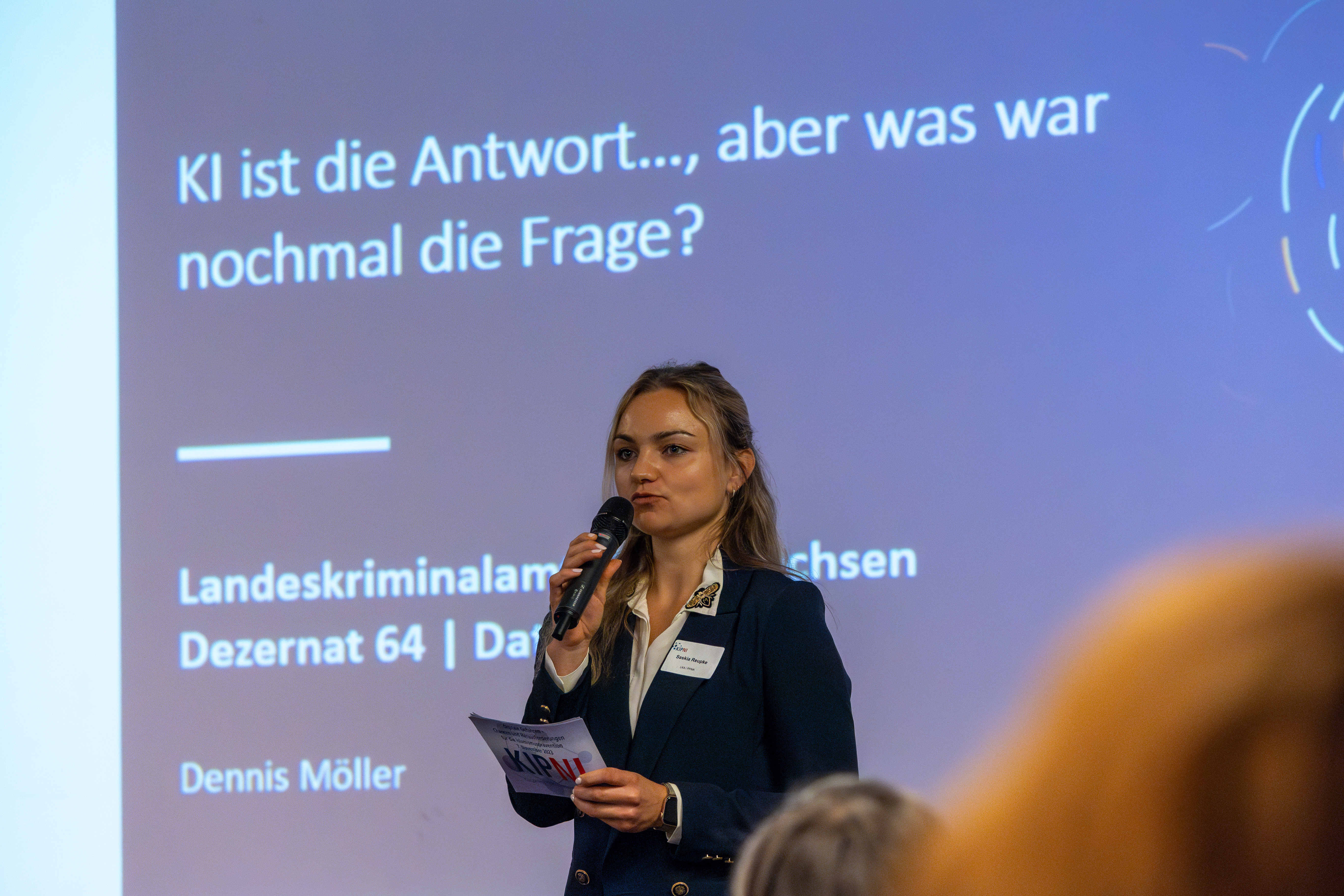Dennis Möller vom Landeskriminalamt Niedersachsen führte das Publikum interaktiv mithilfe der Demonstration von Deep Fakes in Video und Bild an die Chancen und Risiken der künstlichen Intelligenz (KI) heran. Hierdurch sensibilisierte er das Publikum für die KI und deren Fortschritte. Anhand einer inszenierten Unterhaltung mit einem KI- Chatbot verdeutlichte Möller die Herausforderungen für die Präventions- und Deradikalisierungsarbeit.