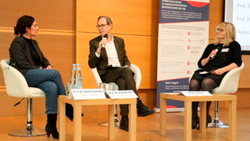 In dem anschließenden von Andrea Oster, Journalistin und Moderatorin beim WDR 5, moderierten Podiumsgespräch veranschaulichten Zick und Foroutan, dass die aktuell zu beobachtenden Radikalisierungsprozesse durch internationale politische Dynamiken verstärkt würden. Zudem betonten sie den Einfluss sozialer Medien, bezüglich derer jungen Menschen oftmals die Fähigkeit fehle, die Inhalte einordnen zu können. Foroutan forderte mehr Transparenz seitens staatlicher Stellen im Umgang mit Desinformation, während Zick betonte, dass vor allem Kinder und Jugendliche besser auf digitale Gefahren vorbereitet werden müssten. Einig waren sich beide Diskutierenden, dass Verbote sozialer Medien kaum Wirkung entfalten würden. Stattdessen bedürfe es mehr ansprechbarer Vertrauenspersonen, insbesondere mit Migrationshintergrund (z. B. aus den Bereichen der Sozialarbeit oder der Polizei), um Zugang zu jungen Menschen zu schaffen und ihnen Orientierung und Unterstützung bieten zu können. Diese Einschätzungen wurden auch in den Publikumsfragen bestätigt, die sich überwiegend auf die Rolle sozialer Medien bezogen.